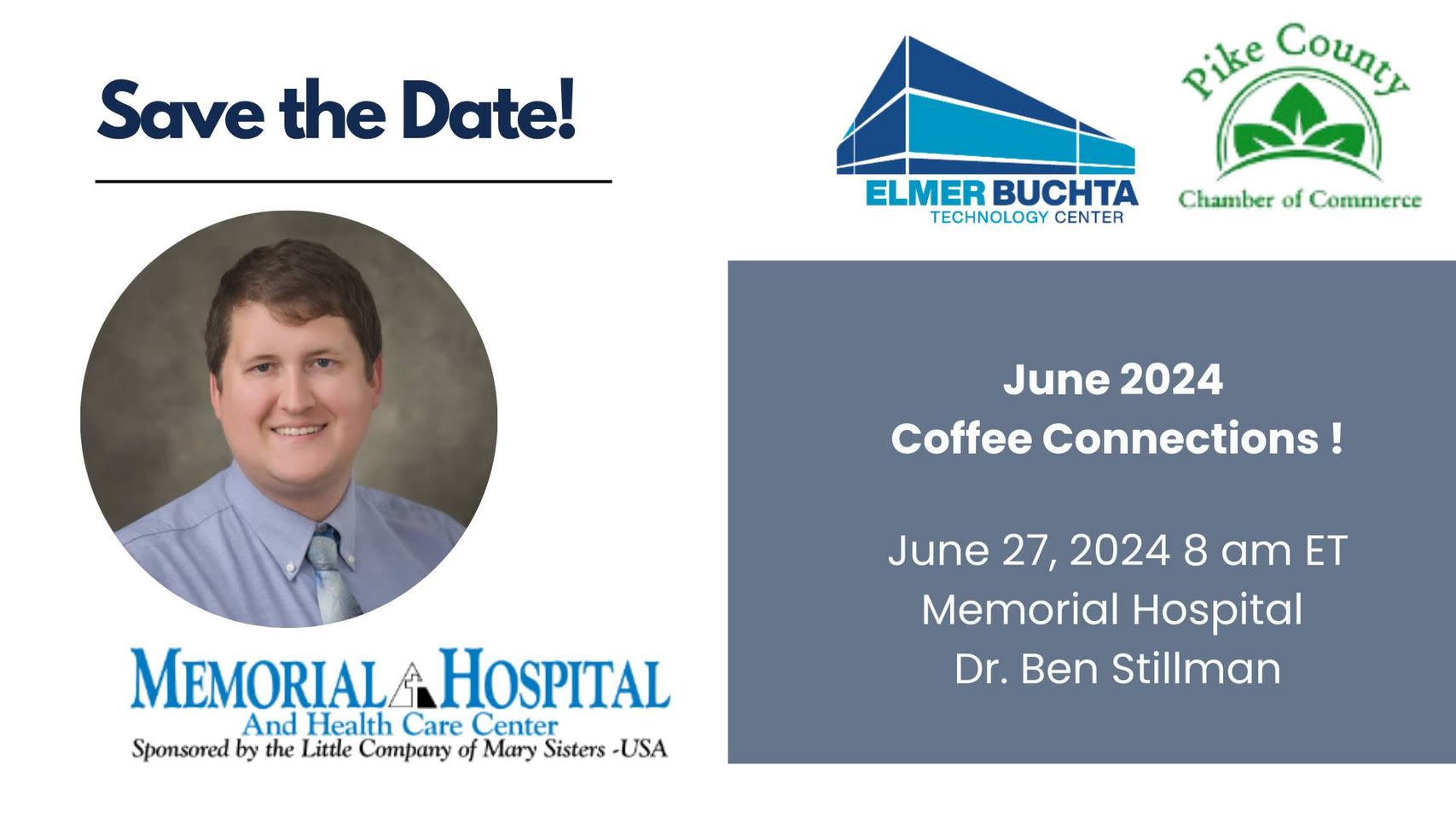 Coffee Connections are monthly networking and educational collaborations with the Pike County, Indiana Chamber of Commerce and the Elmer Buchta Technology Center. Each month we host a local business, organization, or individual that is making an impact on our community. The month of June we will be having guest Dr. Benjamin Stillman with Memorial Hospital and Health Care Center.